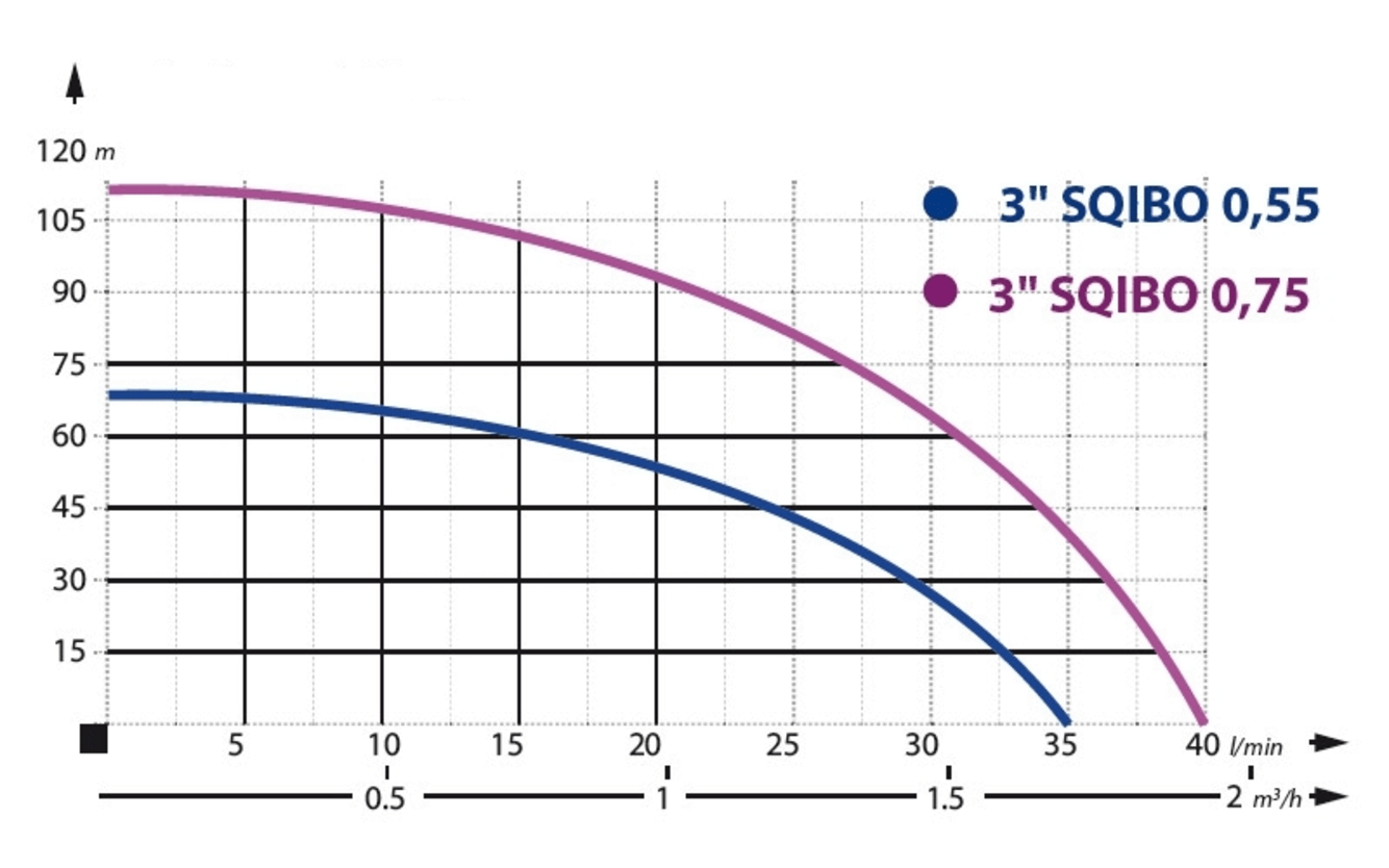 Tyto grafy ukazují, kolik vody je čerpadlo schopno přečerpat při určitém koncovém tlaku.