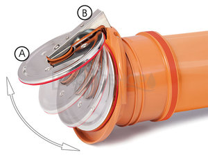 Zpětný ventil je vybaven chromniklovým krytem A pro ochranu klapky a těsnění, jakož i chromniklovým krytem páky B. Chrání proti hlodavcům, povětrnostním vlivům a vlivům prostředí (např. říční proud).
